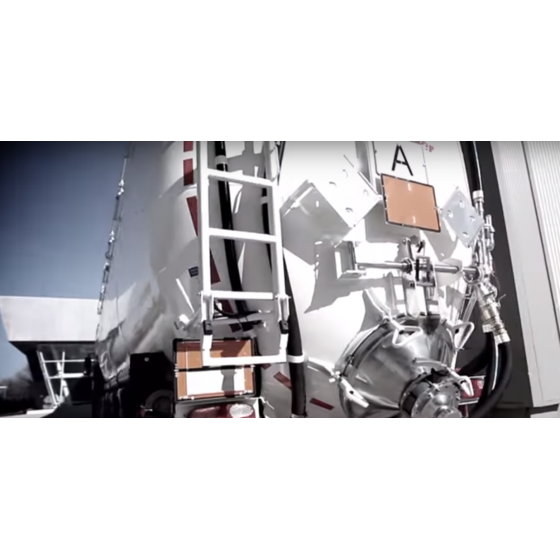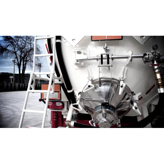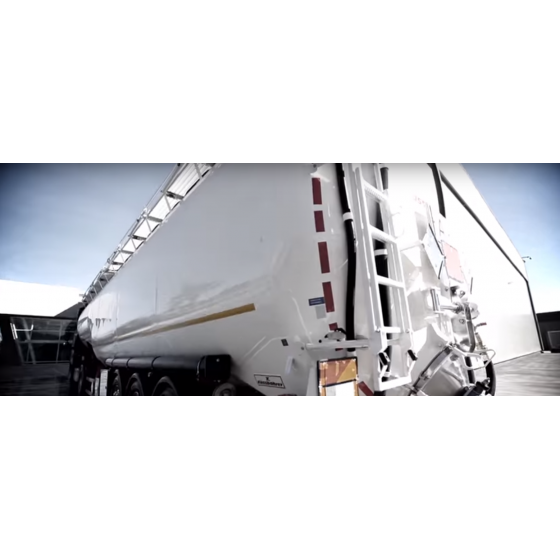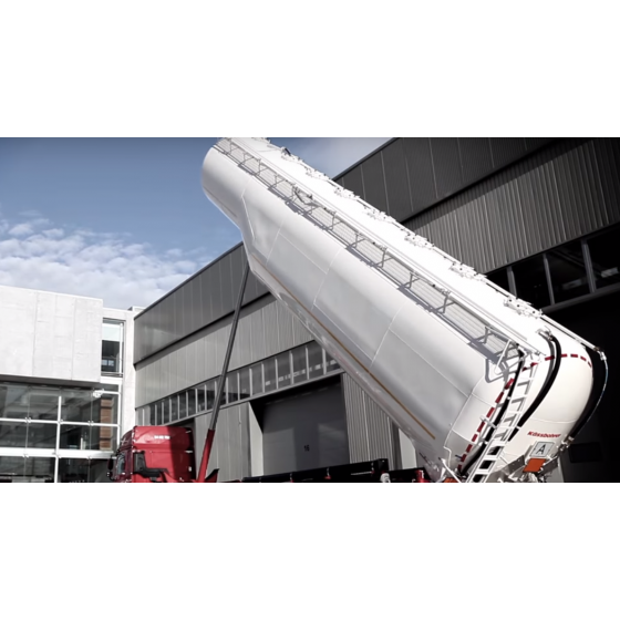 - Тип кузова: Подъемная алюминиевая цилиндрическая емкость с полноразмерными армированными профилями справа и слева от емкости и разгрузочным конусом DN700 в задней части